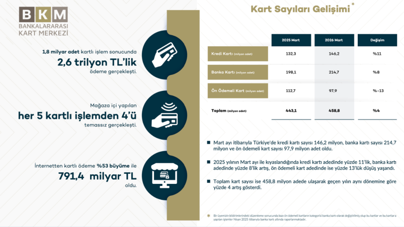 Bankalararası Kart Merkezi (BKM), 2026 yılı Mart ayına ilişkin kartlı ödeme verilerini kamuoyuyla paylaştı. Verilere göre Türkiye’de toplam kart sayısı, geçen yılın aynı dönemine göre yüzde 4 artış göstererek 458,8 milyon adede ulaştı. Bu dönemde en yüksek artış yüzde 11 ile kredi kartlarında yaşanırken, kredi kartı sayısı 146,2 milyona yükseldi. Banka kartı sayısı yüzde 8 artışla 214,7 milyona çıkarken, yapılan kategorisel düzenlemelerin de etkisiyle ön ödemeli kart sayısında yüzde 13’lük bir düşüş kaydedilerek 97,9 milyon adet seviyesinde gerçekleşti.