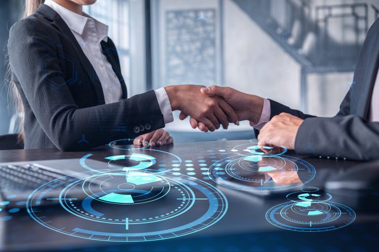 Handshake of two businesspeople as agreement concept to develop a new software to improve service at a company. Technological icons. Woman in business.