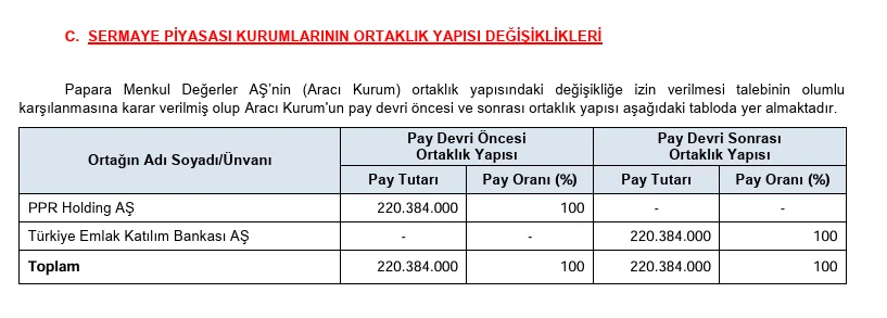 “Papara Menkul Değerler AŞ’nin (Aracı Kurum) ortaklık yapısındaki değişikliğe izin verilmesi talebinin olumlu karşılanmasına karar verilmiş olup Aracı Kurum’un pay devri öncesi ve sonrası ortaklık yapısı aşağıdaki tabloda yer almaktadır.”
